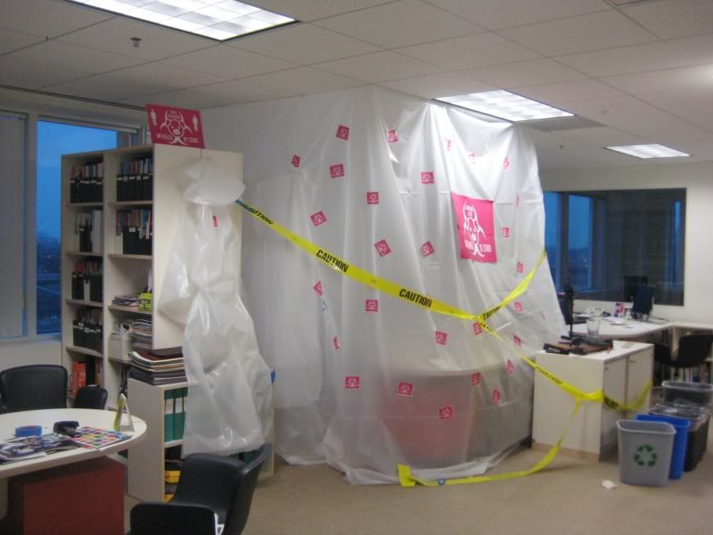 we're not taking any chances - one of my co-workers got back from mexico this morning so this is what we did to his design station while he was away. yes, that is a chem-suit and yes we were wearing gas masks when he came in the office this morning