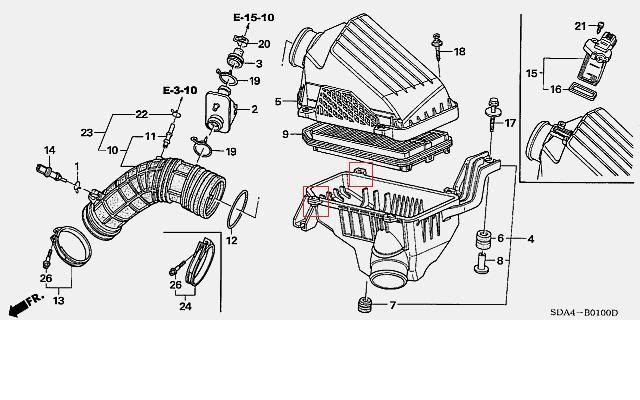 Went to clean my K&N Air Filter only to learn that the wonderful express lube place I used to take my car shattered the bottom part of the stock air box where the top screws down to the bottom. Im currently trying to figure out where to buy another one. I need the bottom part, but there is no number pointing to it. Excuse to get a CAI, maybe. Doubt that will happen though. The things boxed in red were shattered, looked like they had just way over tightned them. Any ideas?